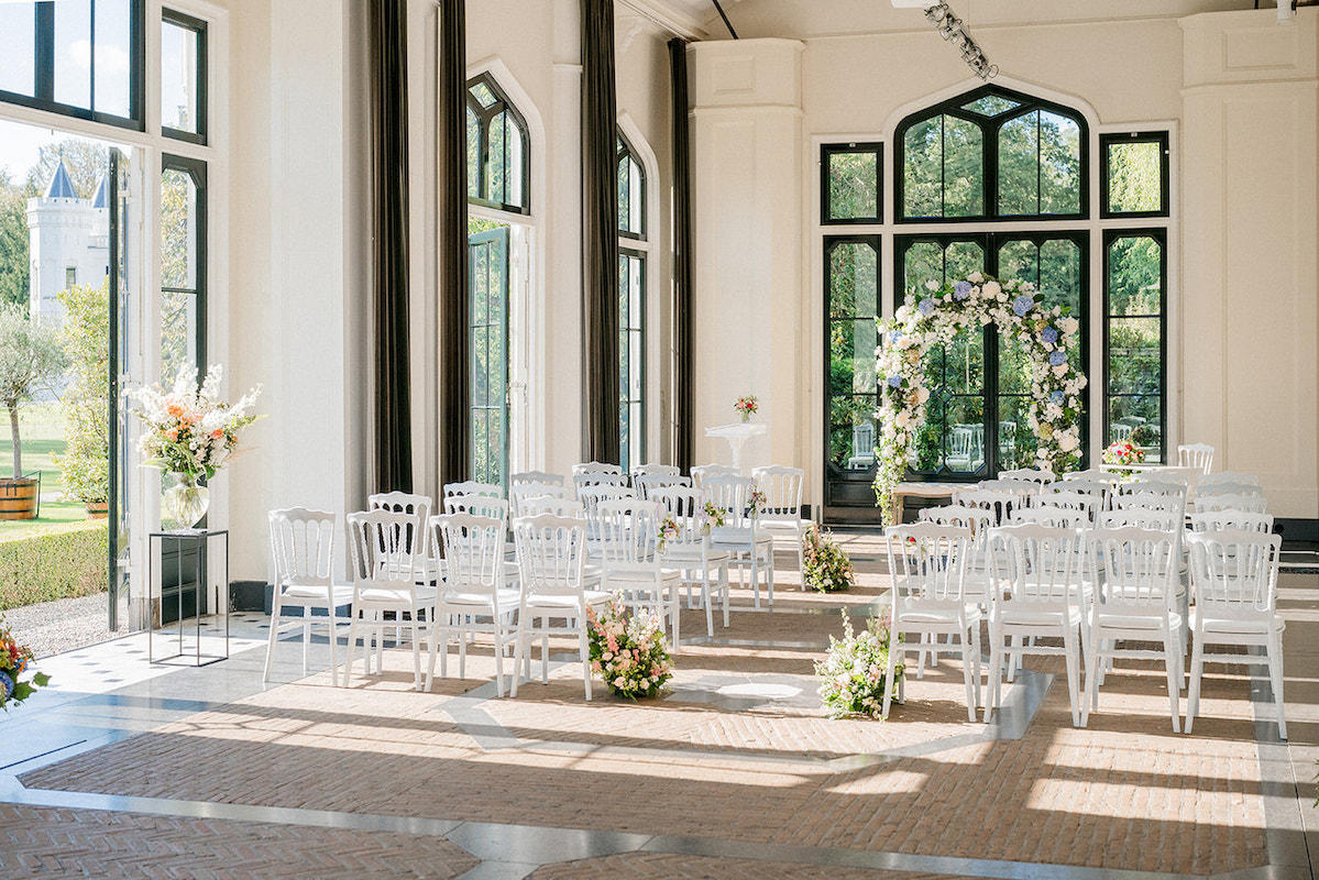 De Oranjerie is een lichte ruimte van wel zeven meter hoog. Op jullie grote dag staat het hele gebouw exclusief tot jullie beschikking; er zijn die dag geen andere huwelijken op het landgoed. Door de zeven grote openslaande deuren kijk je uit op Kasteel Sandenburg en de prachtige landelijke omgeving. Dankzij de grote ramen heeft de Oranjerie een mooie lichtinval, en leent de ruimte zich uitstekend voor het maken van huwelijksfoto’s. De Oranjerie heeft een heerlijk zonnig terras en een eigen tuin. Bij mooi weer zetten we de grote tuindeuren open en is op de achtergrond een orkest van vogeltjes te horen. Misschien krijgen jullie wel bezoek van de pauwen en parelhoenders die vrij door de tuin lopen!